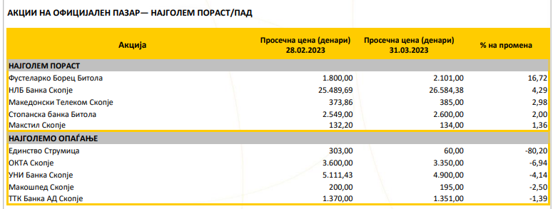 Македонската берза го објави билтенот за март, а оваа се акциите со најголем раст и пад: