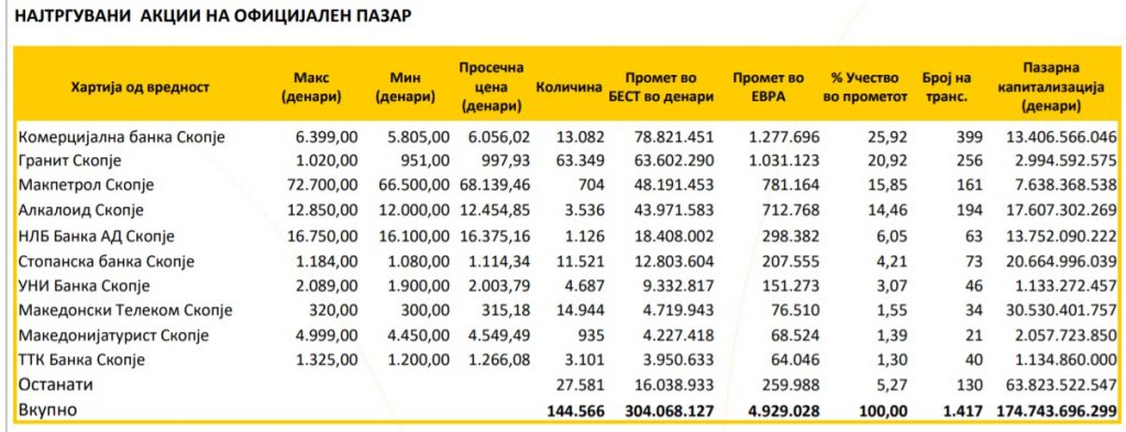 Минатиот месец, на врвот на листата најтргувани се акциите на „Комерцијална банка“. На второто место се акциите на „Гранит“, а на третото место акциите на „Макпетрол“.