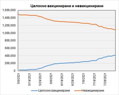 Истата пресметка ја спроведуваме за невакцинираните, при што ќе започнеме со 1.500.000 (бројот на возрасни жители) пред 90 дена, чиј број на 06.08.2021 се намалил на 1.500.000-416.614 = 1.083.386.