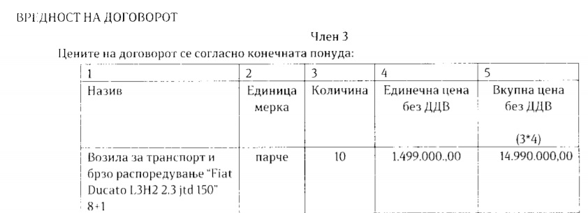 Предмет на набавката се десет возила за брзо распоредување „Фиат Дукато“.