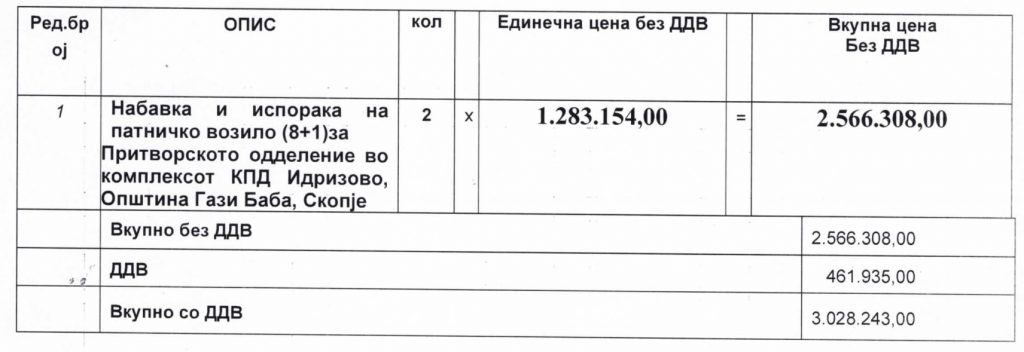Министерството за правда – Управа за извршување на санкциите по распишаниот тендер за набавка и испорака на два патнички возила (комбиња 8+1) за притворското одделение во комплексот КПД Идризово, Општина Гази Баба, Скопје склучи договор со друштвото за трговија и услуги „Автонова“ ДОО експорт-импорт Скопје.