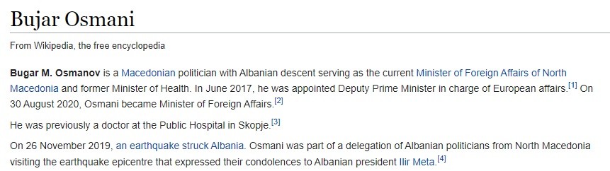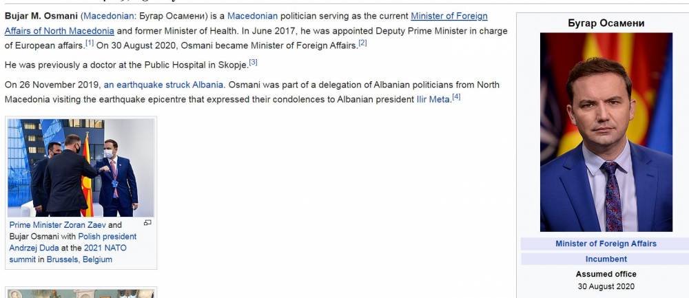 Министерот за надворешни работи Бујар Османи на Википедија на англиски јазик, беше преименуван како Бугар Османов, но и Бугар Осамени.