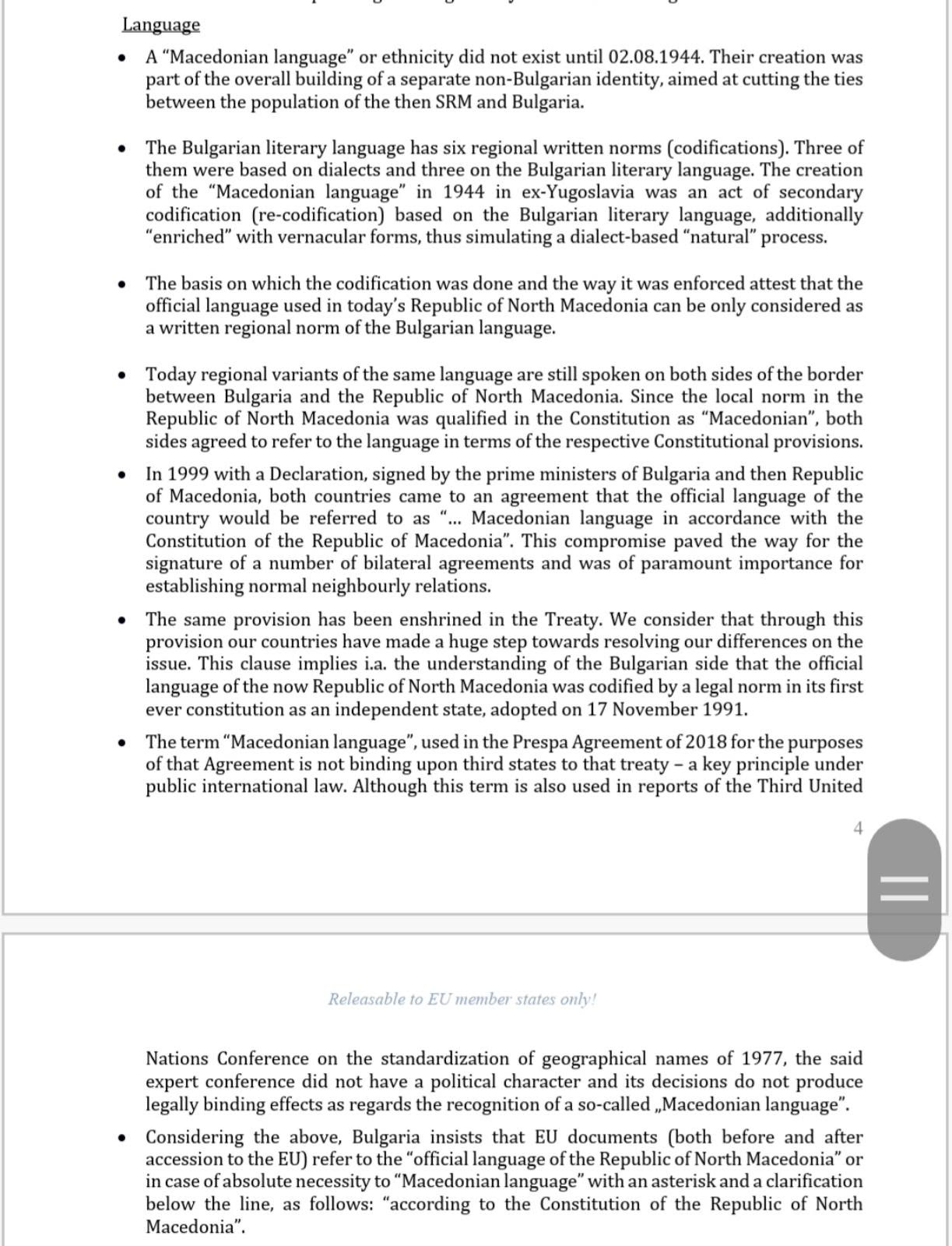Софија исто така ги информира своите ЕУ партнери дека Северна Македонија нема основ да бара права за ниедно население во Бугарија, како што се договорија двете страни, но обвинува дека македонските власти не ја смениле политиката кон лица и организации кои бараат признавање на македонско малцинство во Бугарија, со што го прекршиле членот единаесет од спогодбата.