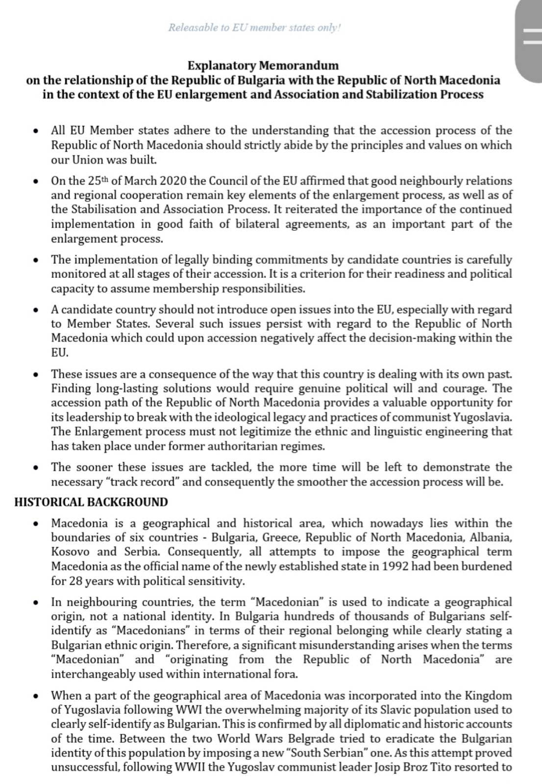 Објаснувачкиот меморандум на Бугарија испратен до земјите членки на ЕУ во пресрет на одлуката за отпочнувањето на преговорите со ЕУ се состои од шест страници со долги историски образложенија за „државна антибугарска идеологија“ во Северна Македонија, јавува дописничката на МИА од Брисел.