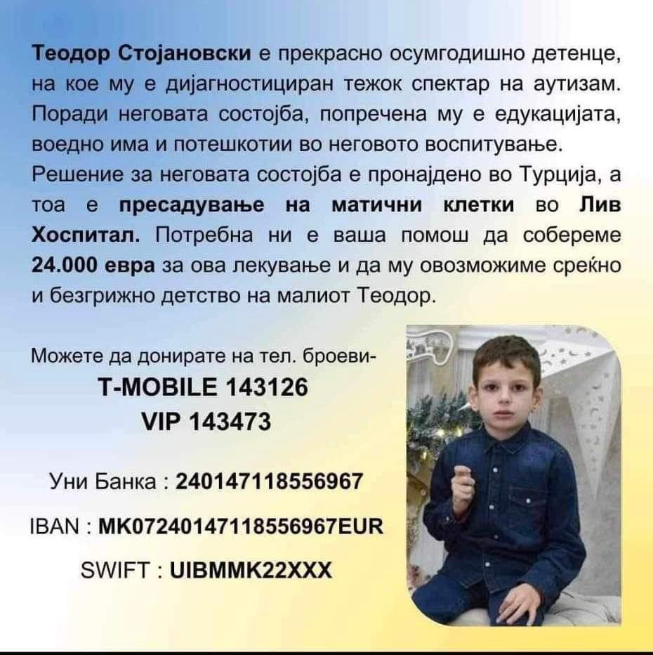 На осумгодишниот Теодор Стојановски му се потребни средства за лекување за пресадување на матични клетки во болницата Лив Хоспитал во Турција, во износ од 24.000 евра.