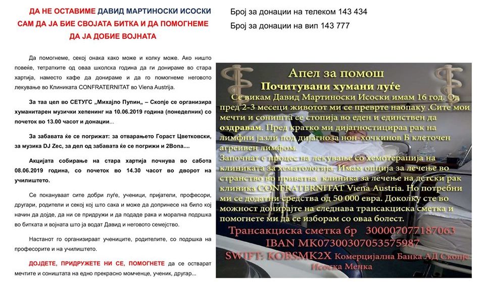Имам опција за лечење на клиниката за деца заболени од рак во Confraternitat Viena Austria, но потребни ми се 50 илјади евра. Доколку сте во можност, донирајте и помогнете ми да се изборам со оваа болест“, вели тој во апелот за помош.