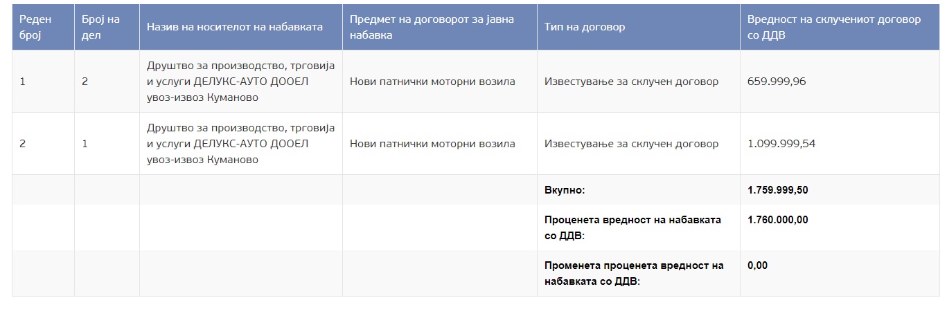 Вкупната вредност на договорите е 1.759.999 денари или околу 28.617 евра.
