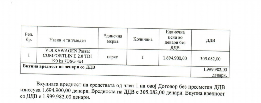 Вредноста на склучениот договор со вклучен ДДВ е 1.999.982 денари или околу 32.500 евра.