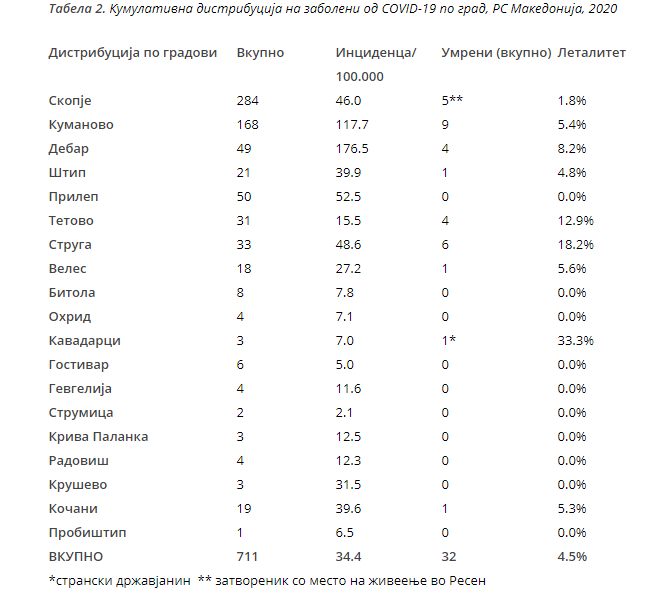 Најголем дел од нив се регистрирани во Скопје и Куманово, додека највисок леталитет (со исклучок на странскиот државјанин од Кавадарци) се регистрира во Струга и Тетово„, стои во анализата на податоците од страна на Институтот за јавно здравје (ИЈЗ).