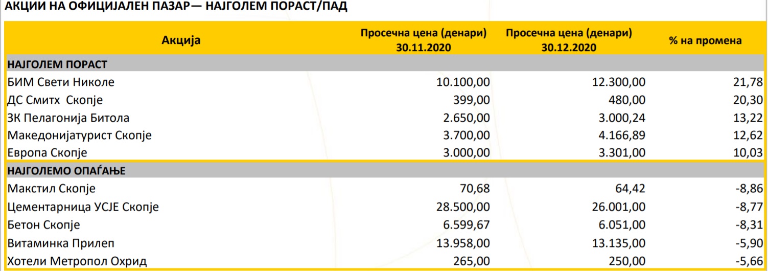 Во декември најголем пораст имале акциите на „БИМ Свети Николе“, а најголемо опаѓање на вредноста акциите на „Макстил“.