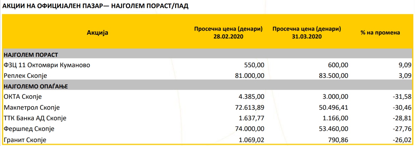 Македонската берза го објави билтенот за март, годинава во кој меѓудругото се објавени податоците за акциите со најголем пораст и пад на вредноста.