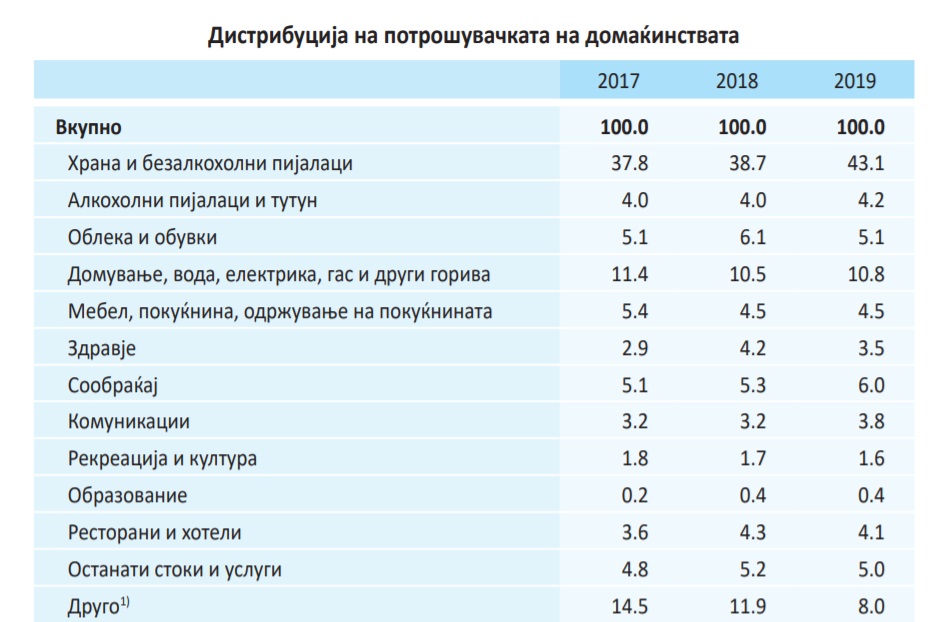 Просечното семејство во Македонија наменува околу 63.4 % од својата потрошувачка за задоволување на основните потреби како што се храната, облеката, домувањето и покуќнината, покажуваат најновите податоци на Државниот завод за статистика.