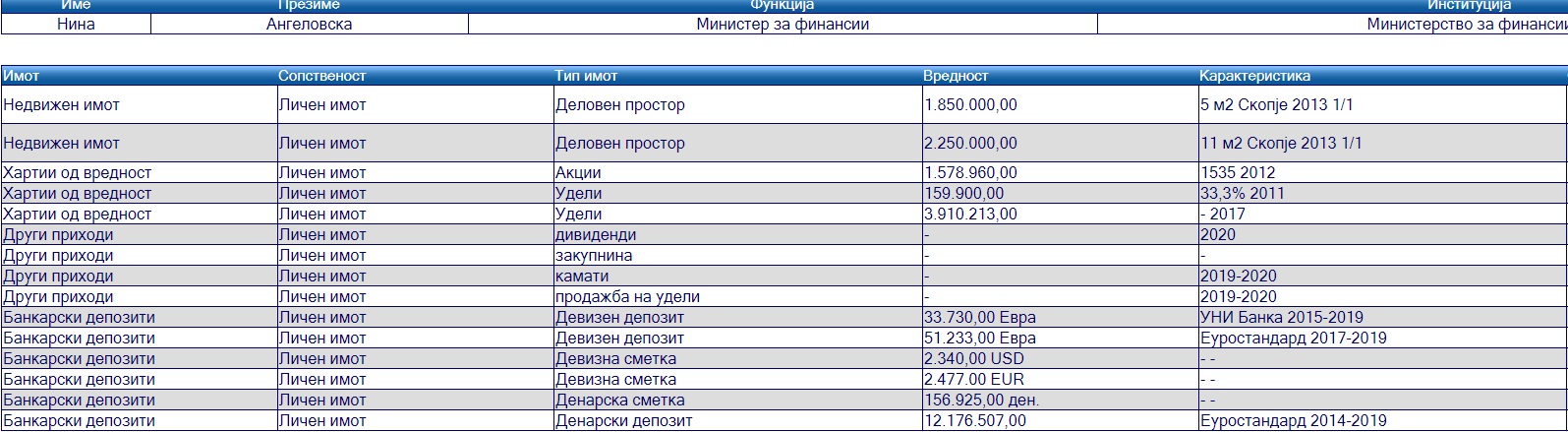 Државната комисија за спречување на корупцијата го објави анкетниот лист за имотната состојба на новата министерка за финансии Нина Ангеловска според кој таа располага со недвижен имот – две канцеларии во вкупна површина од 16 квадрати, хартии од вредност и удели, како и банкарски депозити во вкупен износ од околу 300.000 евра.