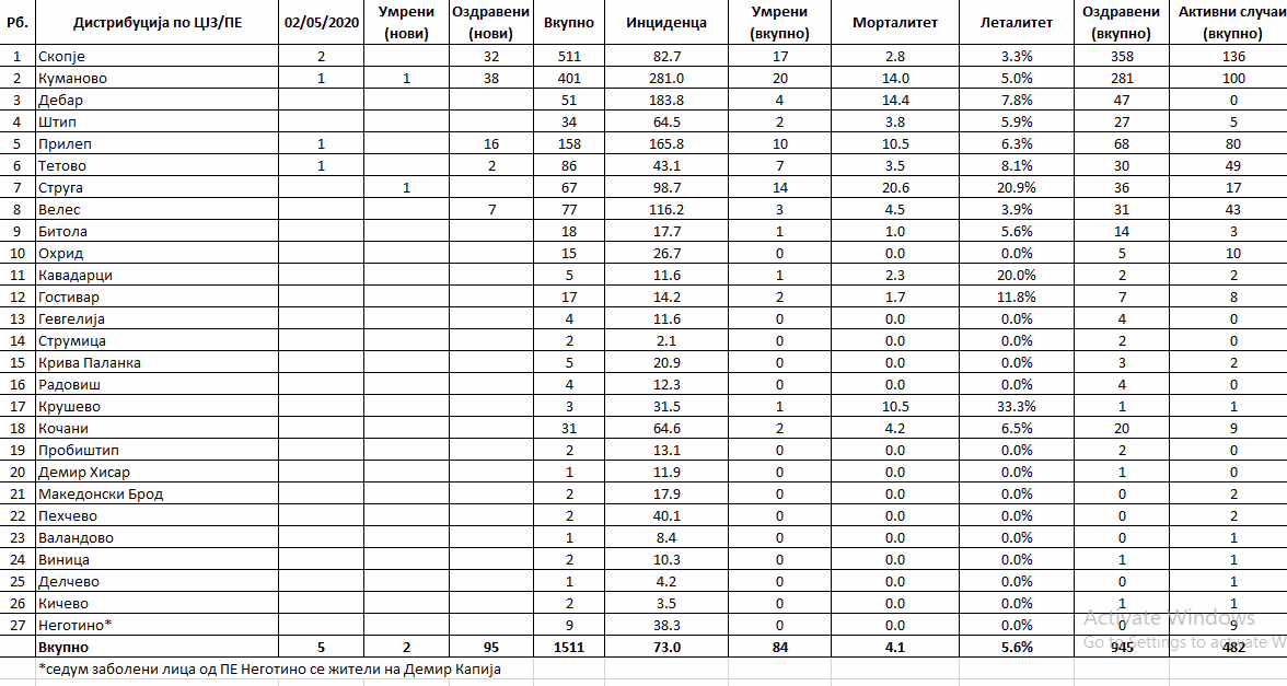 Според последните податоци објавени вчера, во Македонија вкупниот број на заболени од коронавирусот изнесува 1.511, од кои 945 се излекувани, 84 се починати, а активни се 482 случаи.