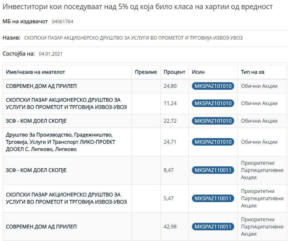 Воедно „Лико-проект ДООЕЛ“ се појавува како акционер со над 5% во акционерската структура на Скопски пазар АД Скопје со вкупно 17.532 обични акции или 24,71% од бројот на обични акции со право на глас, односно 20,49% од вкупниот број на издадени акции од друштвото“, информираа тогаш од компанијата.