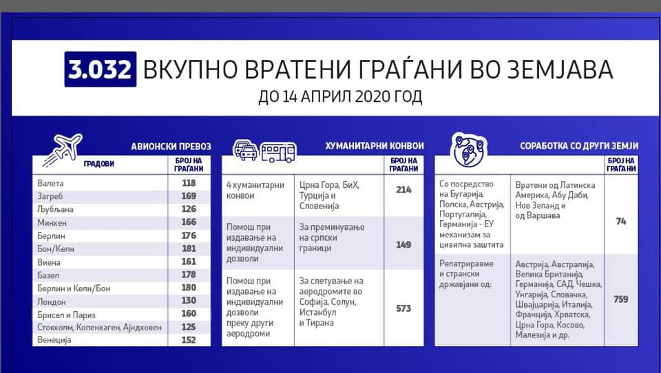 По апелот за пријавување на македонски граѓани затекнати во странство и нивно евидентирање со цел враќање во земјата, како и по јавниот повик за организирање на авионски превоз, но и преку хуманитарни конвои, заклучно со денеска во организација на Министерството за надворешни работи е направена репатријација на 3.032 наши државјани.