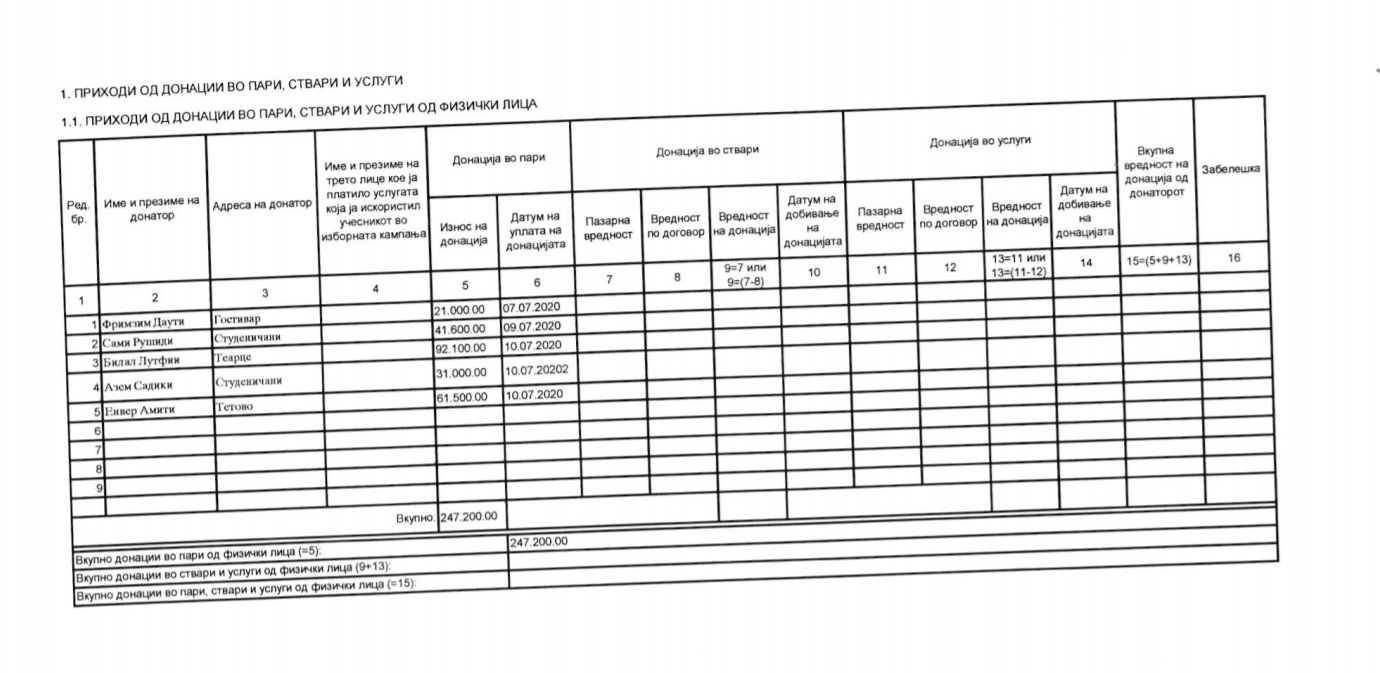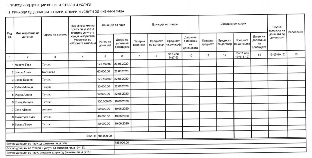 Оваа партија има добиено донации само од 14 физички лица, а меѓу најголемите донатори е лидерот Мендух Тачи.