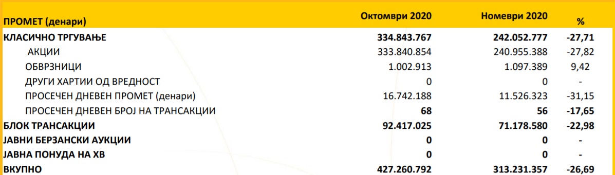 Имено, во ноември прометот изнесувал 313,2 милиони денари, што е намалување за 26,69 отсто во однос на октомври, кога прометот изнесувал 427,2 милиони денари.