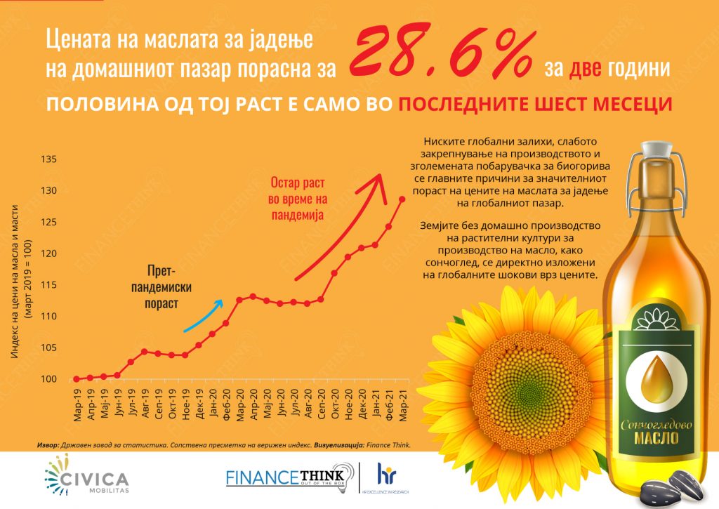 Цената на маслото за јадење во Македонија се зголемила за 28,6 отсто во изминативе две години, а половина од тој раст е остварен во изминативе шест месеци, покажува новата анализа на „Фајненс тинк“.