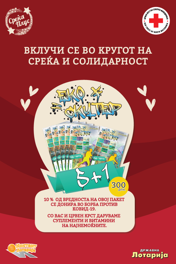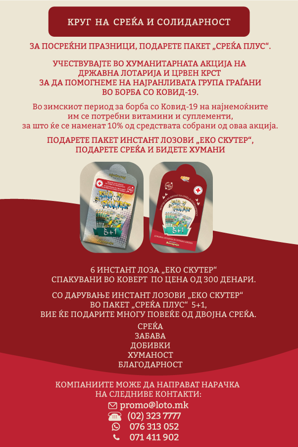 Затоа ги покануваме сите граѓани и сите правни субјекти, во пресрет на престојните новогодишни празници, да подарат инстант лозови „Еко скутер” во пакет „Среќа плус” и да се вклучат во кругот на среќа и солидарност.