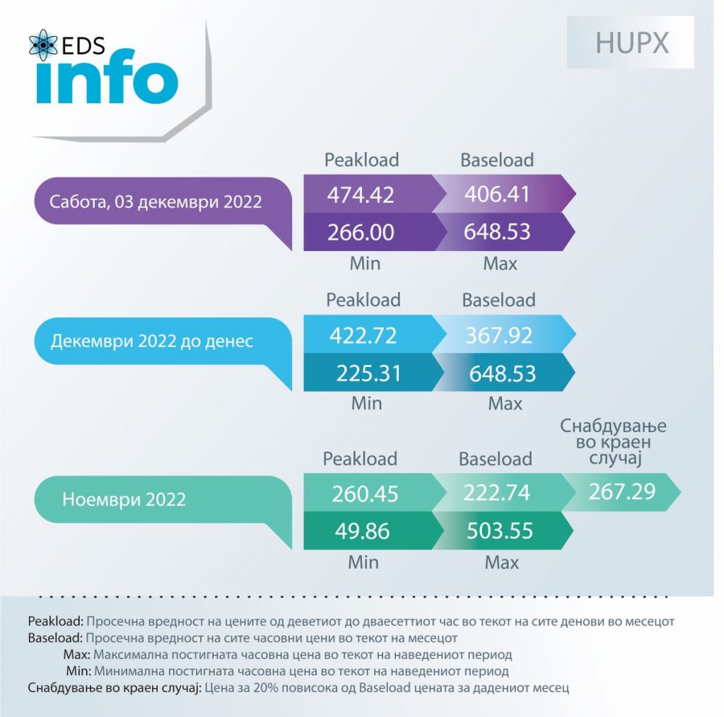 Согласно податоците за движењето на цените на берзата HUPX во Унгарија за 3 декември просечната часовна цена на еден мегават час електрична енергија (baseload) изнесува 406,41 евра/mwh.