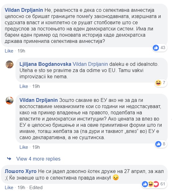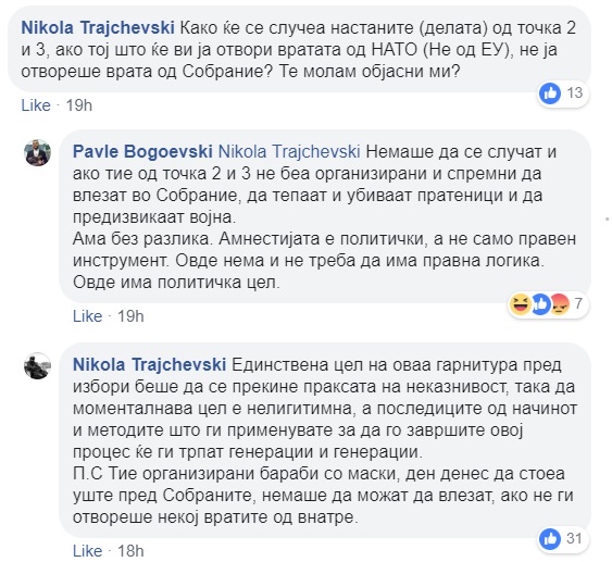 Голем број реакции на Фејсбук предизвика статусот на пратеникот Павле Богоевски со кој тој се обиде да оправда зошто гласал „за“ Законот за амнестија иако претходно беше еден од главните поборници да нема простување за настаните на 27 април.