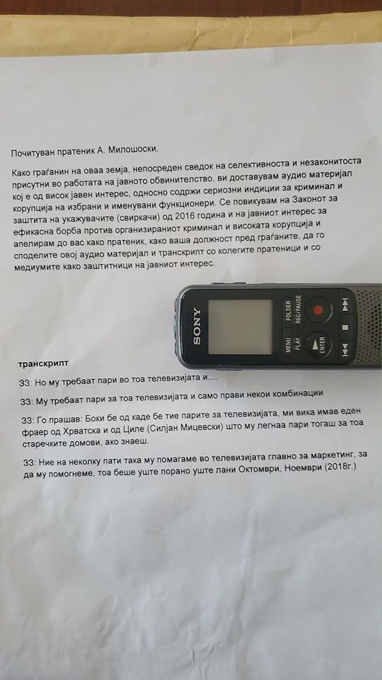 Во прилог на овој материјал ќе го доставам и транскриптот од чија содржина произлегува сомнеж за тоа дека господинот Зоран Заев бил во тек со нелегалното финансирање на “Меѓународниот сојуз” на Бојан Јовановски преку рекетирање на стопанственици, како и дека тој лично од позицијата премиер го помагал финансирањето на телевизијата 1ТВ.