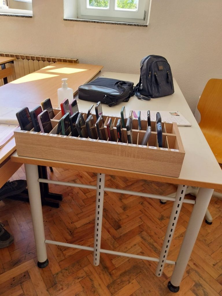 -Има време и за мобилни телефони, но на училиште, најважен е часот и предавањето на наставникот. Со одлука на Наставнички совет, сите ученици и наставници задолжително ги оставаат своите мобилни телефони во кутиите со прегради кои ги набавивме специјално за таа намена. Секако дека за време на одморите можат да се користат.