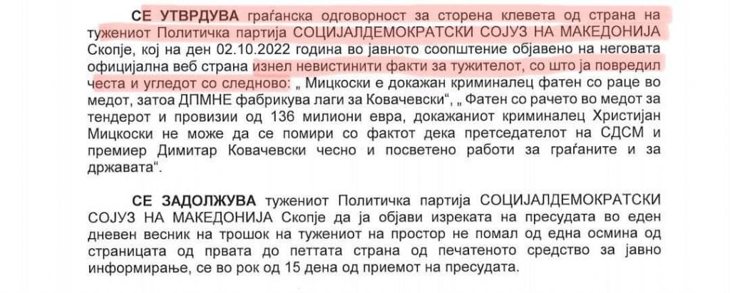 Лидерот на опозициската ВМРО-ДПМНЕ, Христијан Мицкоски на својот Фејсбук профил информираше дека ја добил на суд владејачката СДСМ.