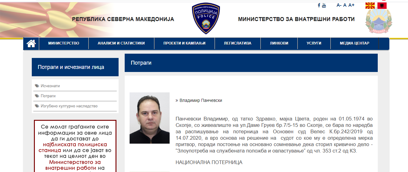 (Фото) Национална потерница за поранешниот претседател на Кривичен, Панчевски