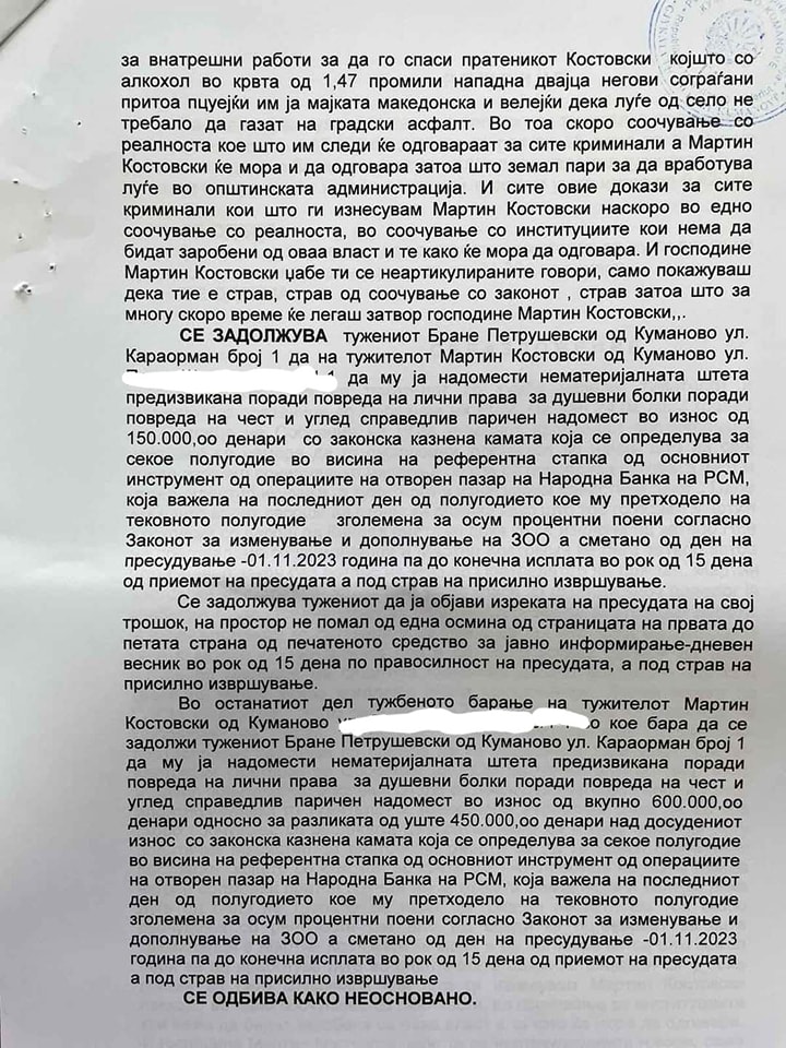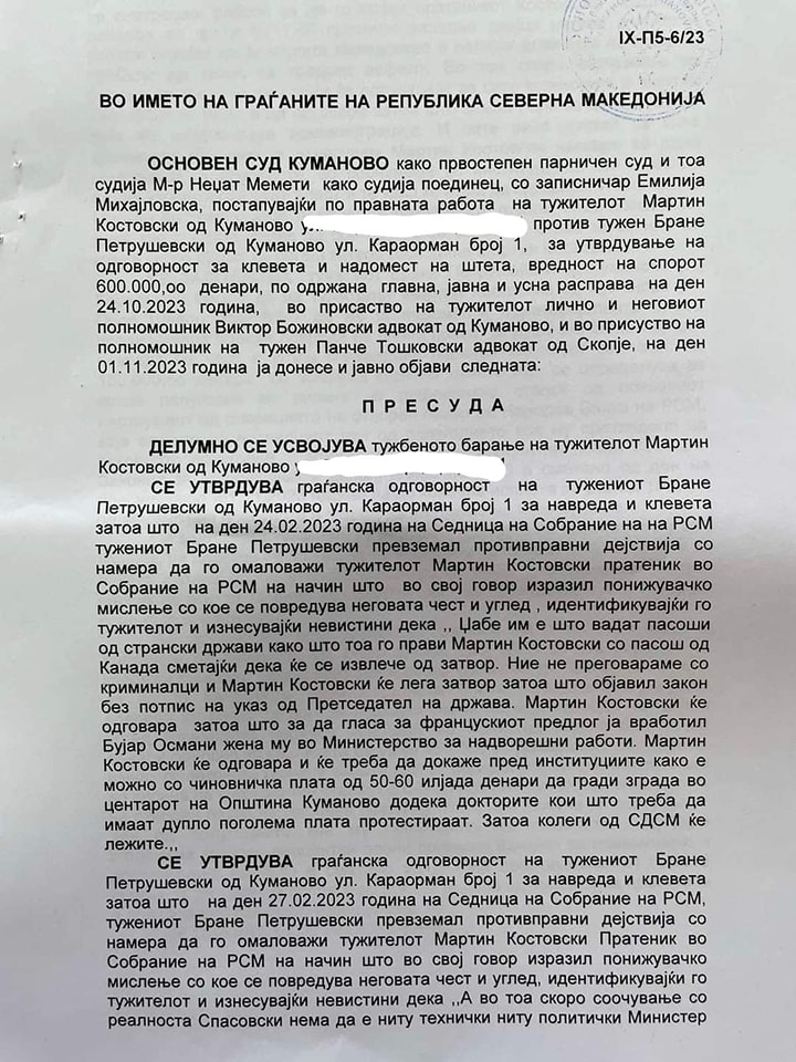 Според пресудата која ја донесе Основниот суд Куманово, тој на пратеникот од владејачката СДСМ, Мартин Костовски, треба да му исплати околу две илјади евра плус камата за душевна болка предизвикана од навреда.