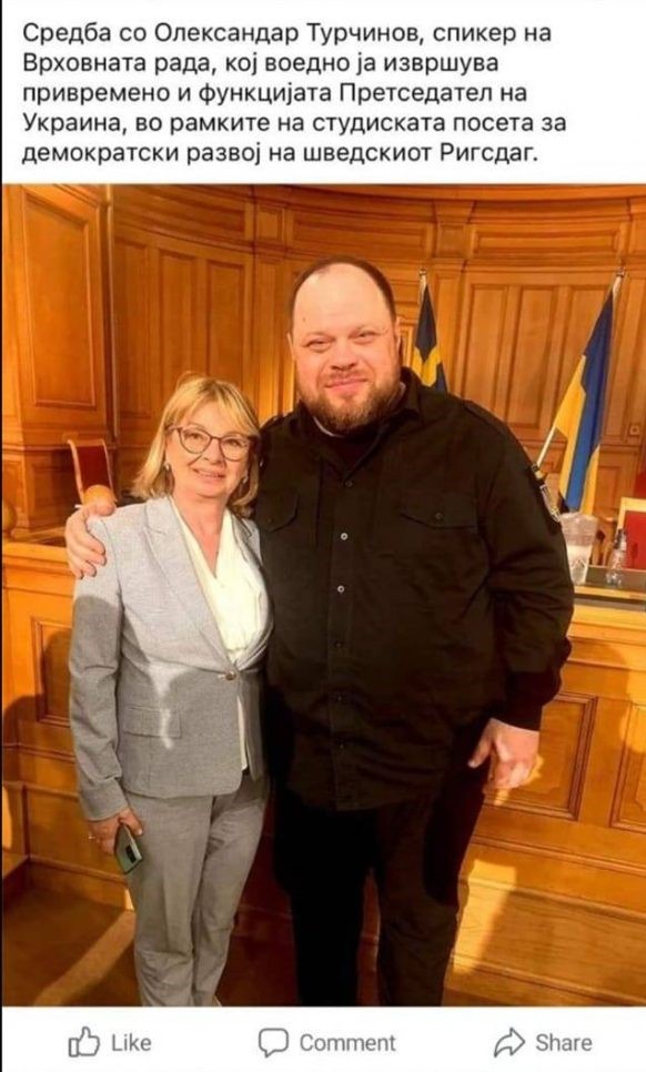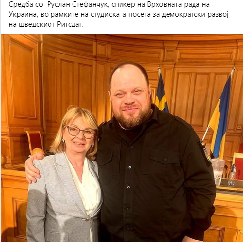По реакциите таа ја смени објавата и напиша: „Средба со Руслан Стефанчук, спикер на Врховната рада на Украина, во рамките на студиската посета за демократски развој на шведскиот Ригсдаг“.