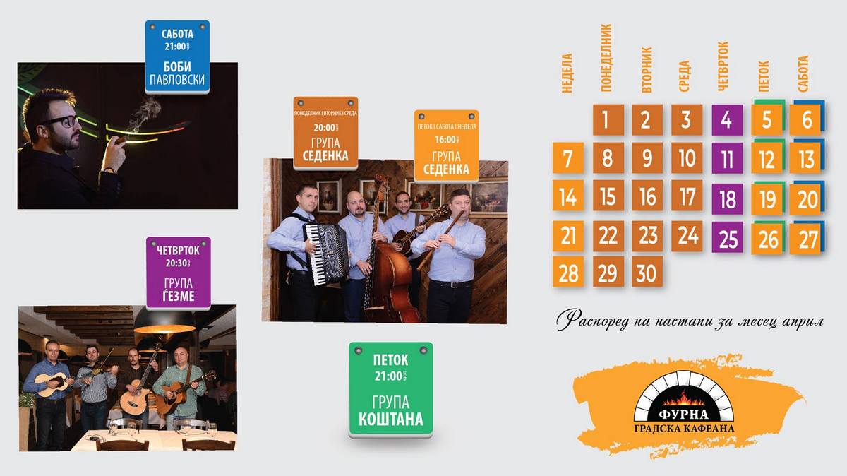 Со самото влегување на врата во перфектно одредени термини ве пречекува звукот од инструментите на музичарите кои од срце ќе ви запеат нешто по ваш мерак. Месец април е исполнет со извонредна музичка програма чиј репертоар се сервира од групата „Седенка“, „Ѓезме“, „Коштана“ и „Боби Павловски“.