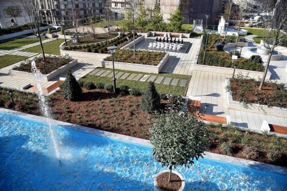 Поставени се неколку водени зони во форма на фонтани и базени, монтажна бина, амфитеатрални скали, партерно шаховско поле и модерна урбана опрема согласно со потребите на посетителите. На тој начин делумно се надоместува загубеното зеленило во делот на Малиот ринг.