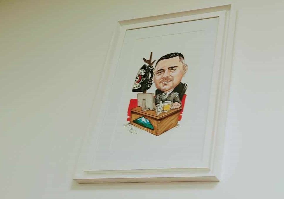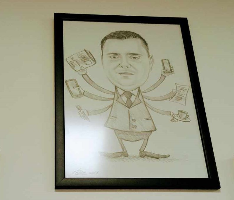 На еден од ѕидовите висат и две карикатури со него, подароци од Кабинетот, кои дефинитивно го доловуваат неговиот дух.