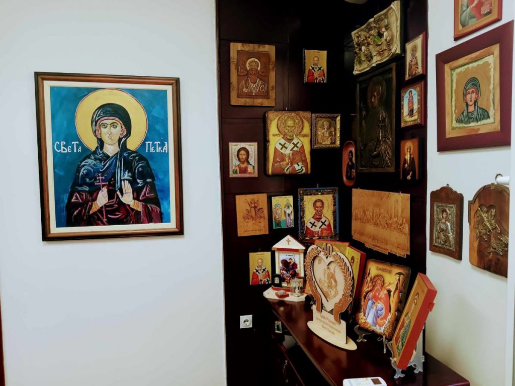 Едно ќоше е целото покриено со подарени икони.