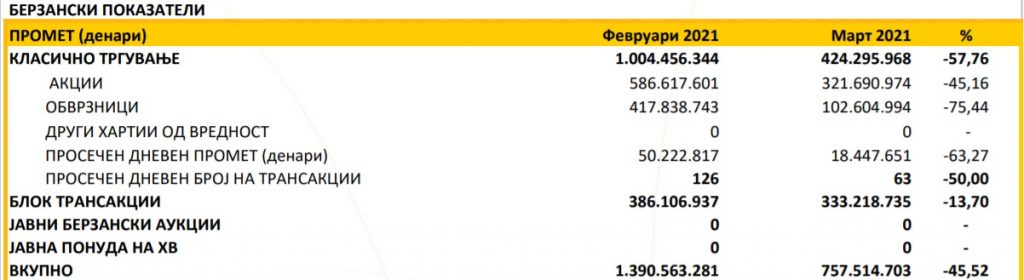 Имено, прометот на берзата минатиот месец изнесувал 757,5 милиони денари, што е намалување за 45,52 отсто во однос на февруари кога прометот изнесувал 1,3 милијарди денари.
