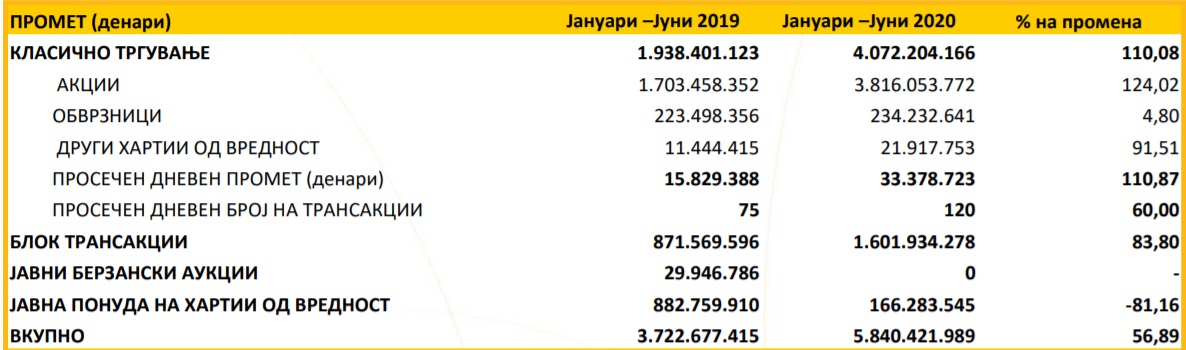Македонската берза го објави билтенот за периодот јануари-јуни 2020 година во кој може да се забележи пораст на прометот во однос на првото полугодие од 2019 година.