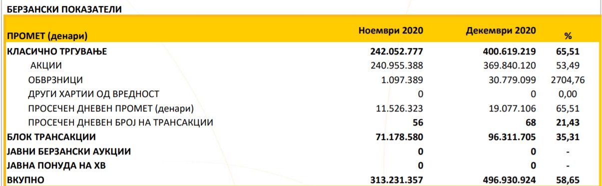 Во декември на берзата е остварен вкупен промет од 496,3 милиони денари, што е пораст од 58,6 отсто во однос на номеври кога прометот изнесувал 313,2 милиони денари.