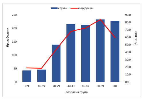 Најголем број (n=233) на заболени се на возраст од 50-59 години или 20,9%, каде е регистрирана и највисока специфична инциденца – 83,8/100.000.