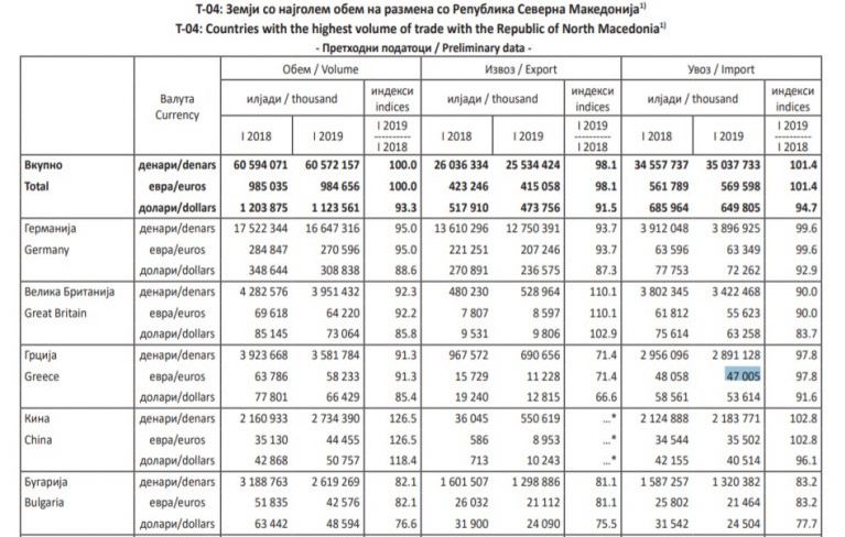 Извозот кон Грција во јануари, годинава изнесувал 11,2 милиони евра, а увозот околу 47 милиони евра, што значи дека државава има минус во трговската размена со јужниот сосед.