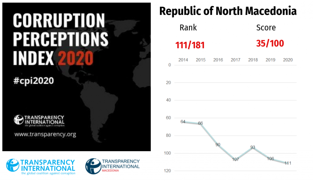 “Оваа година ИПК 2020 го бележи најнискиот резултат и најниското рангирање на Р.С. Македонија на Индекстот за перцепција на корупцијата од 2001 година кога првпат бевме рангирани.