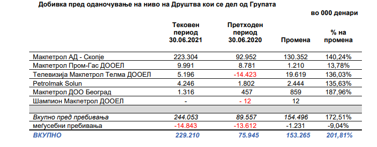 Консолидираната добивка пред оданочување изнесува од 229,2 милиони денари и истата е поголема за цели 201,81%, односно, поголема за приближно три пати од остварената добивка минатата година кога изнесуваше 75,95 милиони денари“, велат од компанијата.