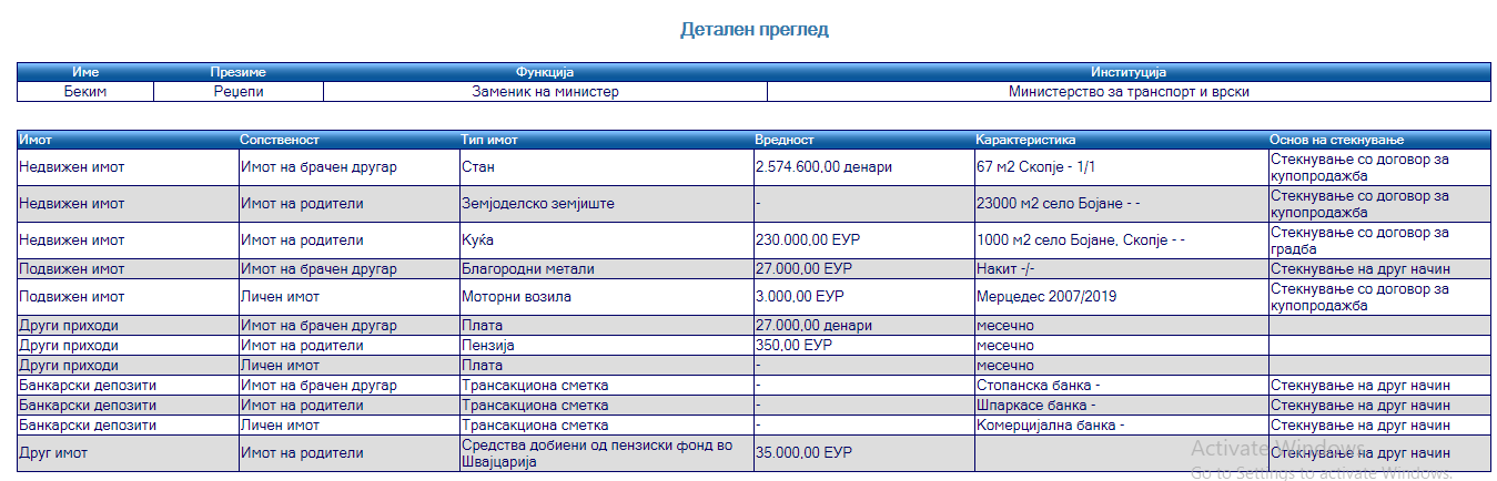 Каков имот пријавил Беким Реџепи, заменик министер за транспорт и врски