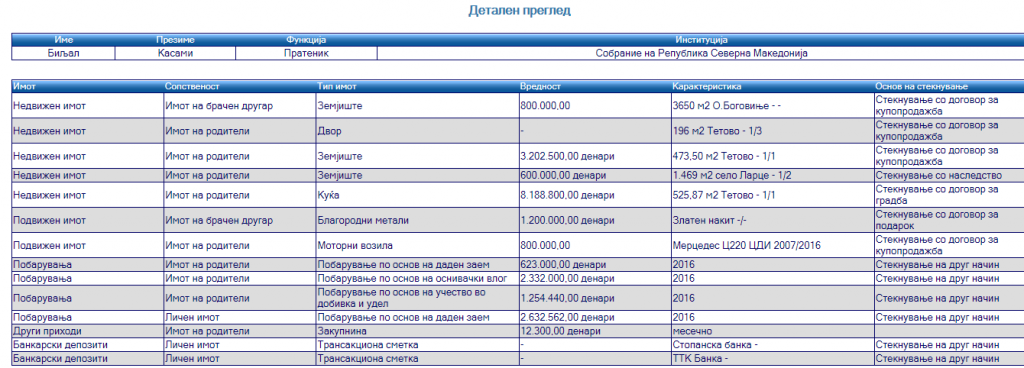 Напоменуваме дека сме во можност да објавиме информации само за оние кои се актуелни или поранешни функционери, па имале обврска да го пријават имотот до Државната комисија за спречување на корупција (ДКСК).