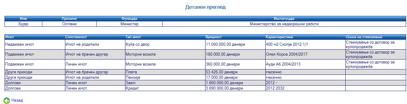 Министерот за надворешни работи, Бујар Османи нема недвижен имот на свое име.