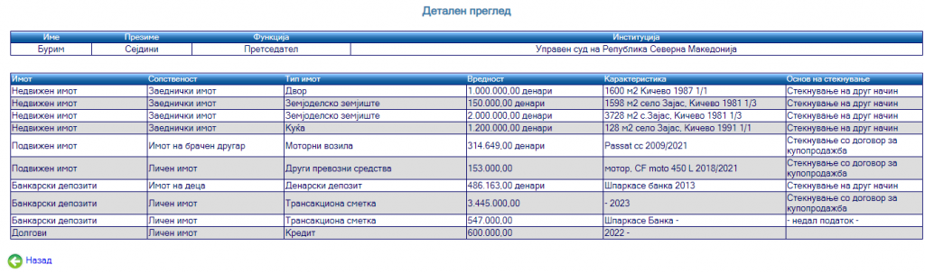 Каков имот пријавил Бурим Сејдини, претседателот на Управен суд, против кого вработени поднесоа кривична
