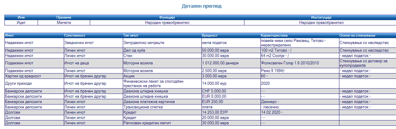 Има и два кредити. Последниот од 14.253 евра го зел годинава, нема податок до кога треба да го врати. Исто така нема податок ни кога треба да го врати и кредитот од 20 илјади евра, а нема ни податок кога го зел.