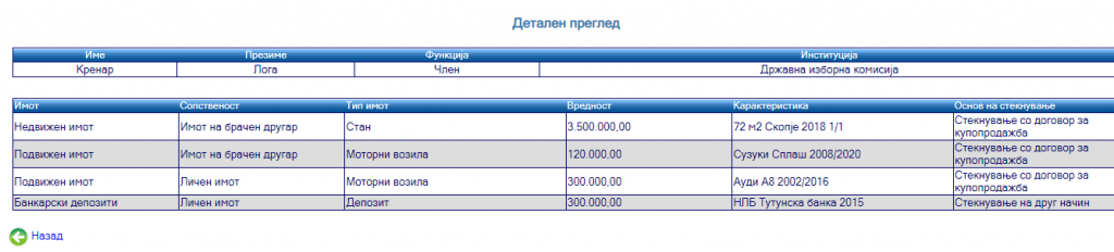 Според неговиот анкетен лист на свое име пријавил возило Ауди 8 и депозит од 300 илјади денари.