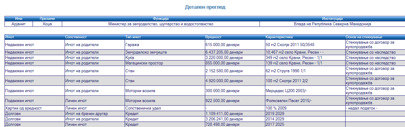 Според неговиот анкетен лист на свое име пријавил само возило Фолксваген Пасат, сопственички удел, за кој не дал податок – каде, и кредит од 728 илјади денари, кој треба да го врати до 2025 година.
